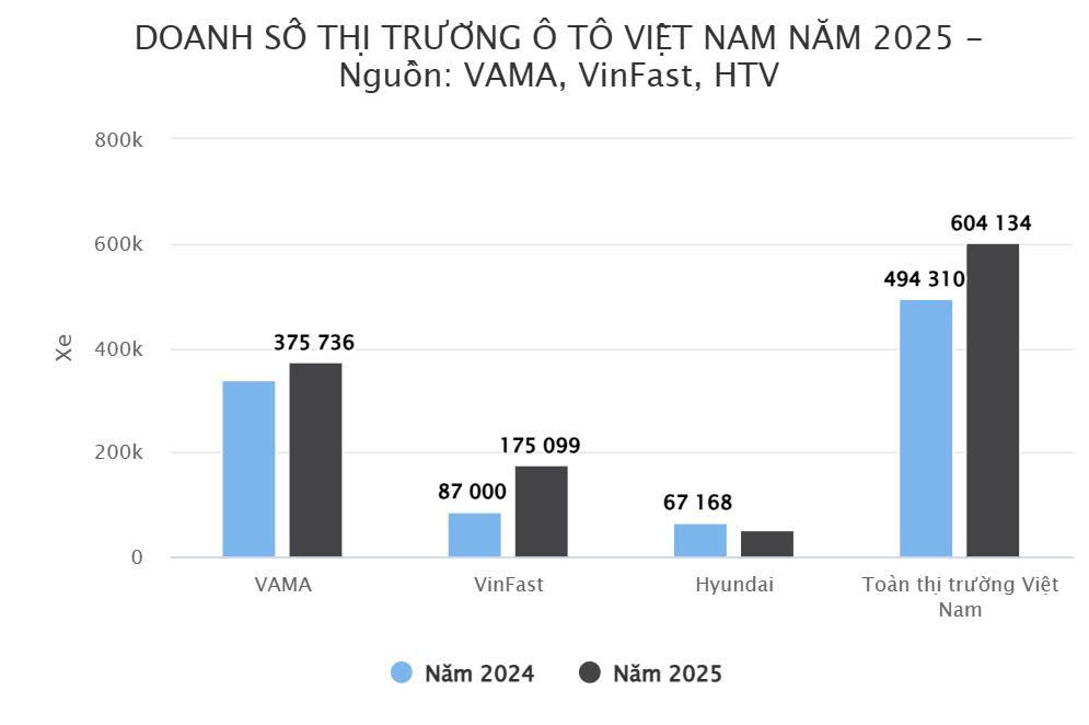 Tính cả doanh số bán ô tô điện của VinFast (đạt hơn 175.099 xe) và ô tô Hyundai do Liên doanh Hyundai Thành Công Việt Nam - HTV lắp ráp, phân phối (đạt 53.229 xe), trong năm 2025 người Việt đã mua sắm hơn 604.134 xe ô tô mới các loại. Qua đó, vượt lượng xe bán ra trong năm 2022 để lập kỷ lục mới về doanh số bán hàng. Con số này thậm chí còn chưa bao gồm doanh số của các thương hiệu ô tô nhập khẩu như Mercedes-Benz, Audi, Jaguar Land Rover, Volvo, Nissan, MG… cũng như gần chục thương hiệu ô tô Trung Quốc đã gia nhập thị trường Việt Nam (như BYD, Lynk & Co, Omoda & Jaecoo, Geely, Wuling, Haima, Haval…)