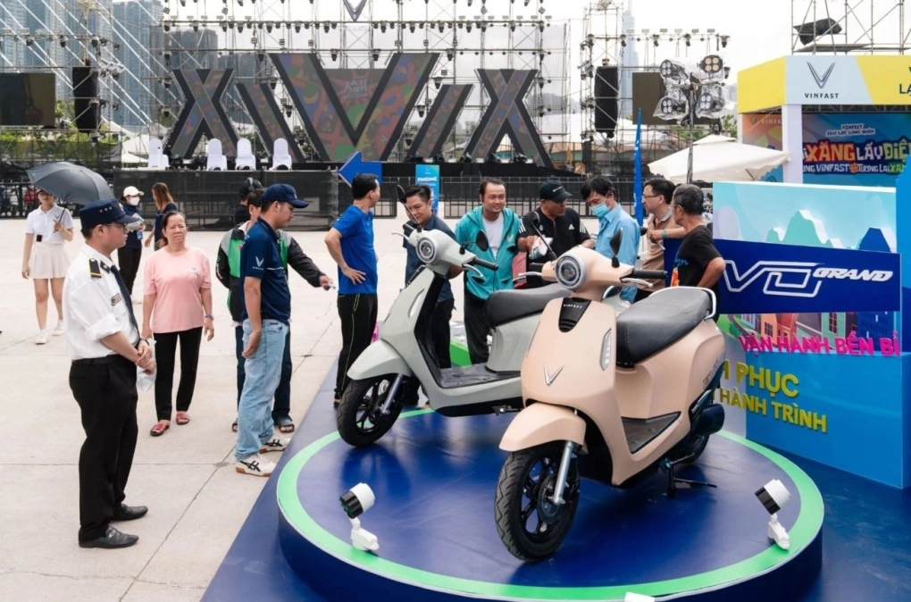 Khách hàng tìm hiểu xe máy điện VinFast tại một sự kiện "Đổi xăng lấy điện" do hãng tổ chức liên tục trên quy mô toàn quốc. Ảnh: VinFast