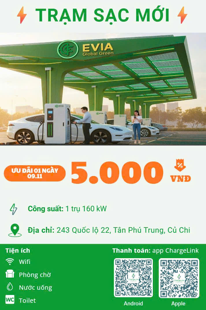 Sáng ngày 09/11/2025, EVIA Global Green chính thức khai trương trạm sạc xe điện công suất cao tại địa chỉ 243 Quốc lộ 22, Củ Chi, TP.HCM, đánh dấu một bước tiến quan trọng trong chiến lược mở rộng mạng lưới hạ tầng sạc xanh toàn quốc.
