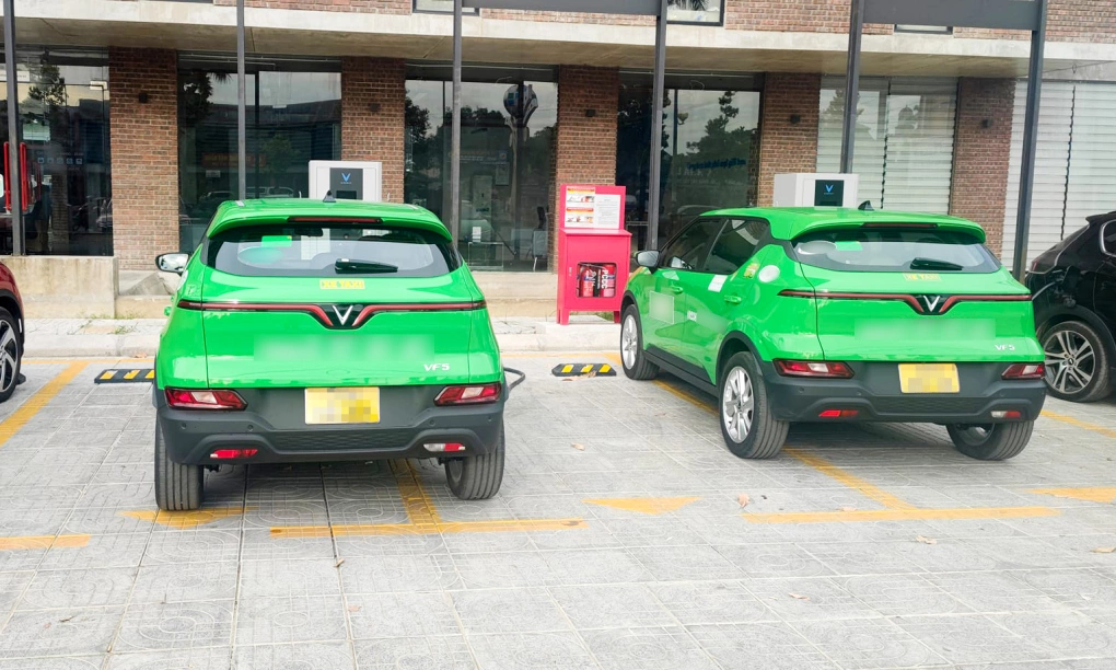 Hai chiếc taxi điện chiếm 3 ô đỗ tại một trạm sạc công cộng ở Nghệ An. Ảnh: OF Nghệ An