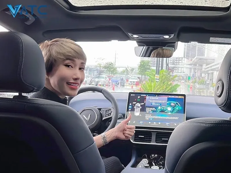 Người dùng trải nghiệm công nghệ thông minh trên xe ô tô điện VinFast.
